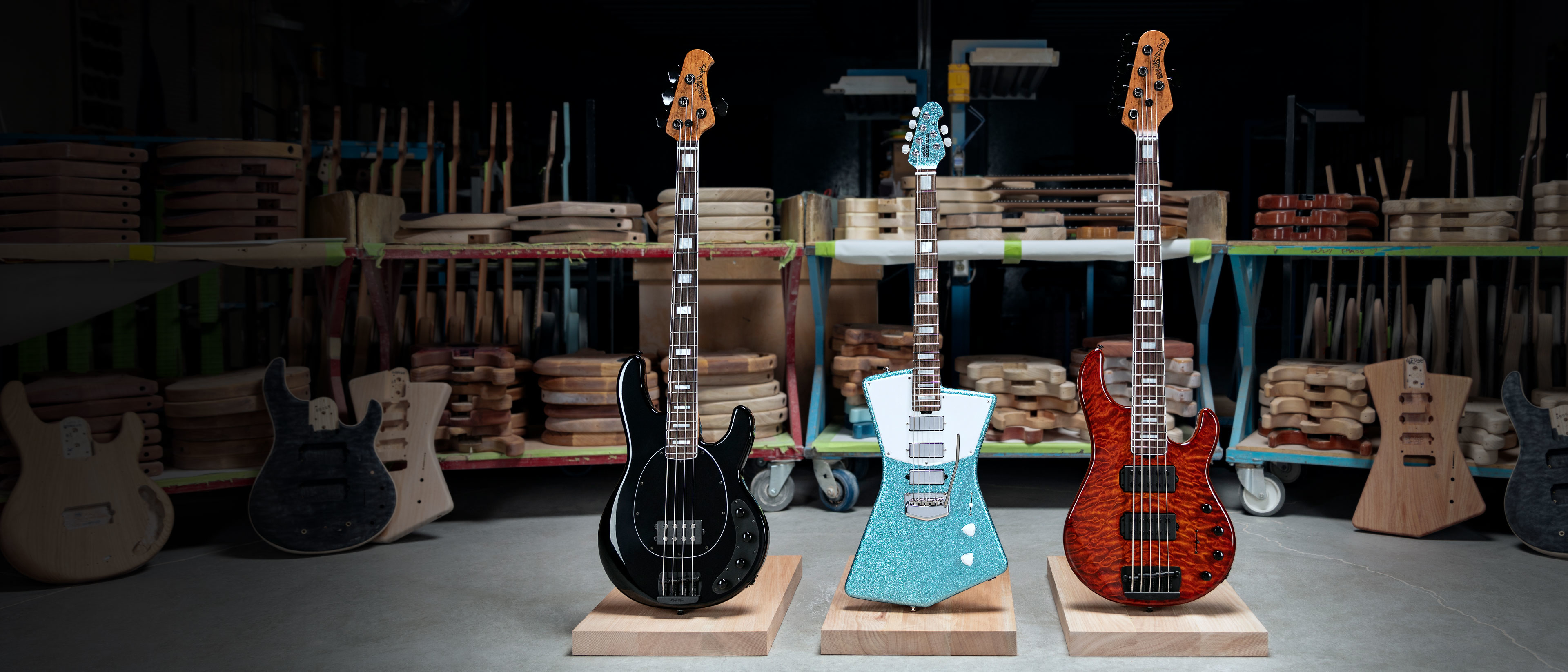 Este mes presenta la StingRay Special 4H en Hades Black, la St. Vincent HHH en Turquoise Crush y la Stingray 5 HH en Giants Orange Quilt.