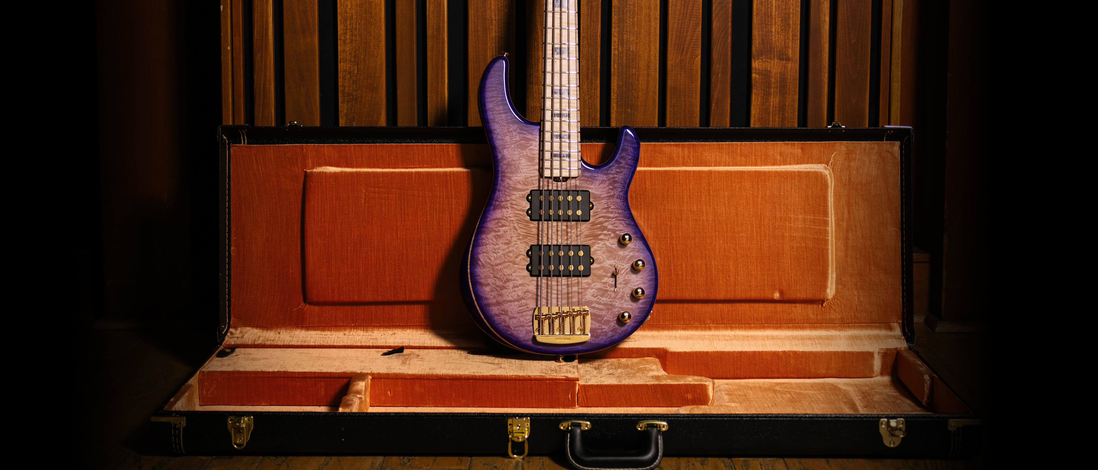 Limited to 100 units worldwide, the Ball Family Reserve "Moonbeam" StingRay Special 5 HH bass highlights a beautiful purple burst finish on both the front and back of the bass and is constructed of premium lightweight ash with a figured maple top. The 22-fret oil-and-wax polished white flamed maple neck and fingerboard are tastefully accentuated with pearlescent purple block inlays, a matching figured maple headstock, and all gold hardware. Equipped with dual Music Man neodymium humbucking pickups, a 3-band EQ, an 18-volt preamp, and a 5-way switch, this bass delivers the legendary Stingray 5 punch and growl. Each bass ships with a certificate of authenticity and a custom G&G hardshell case.