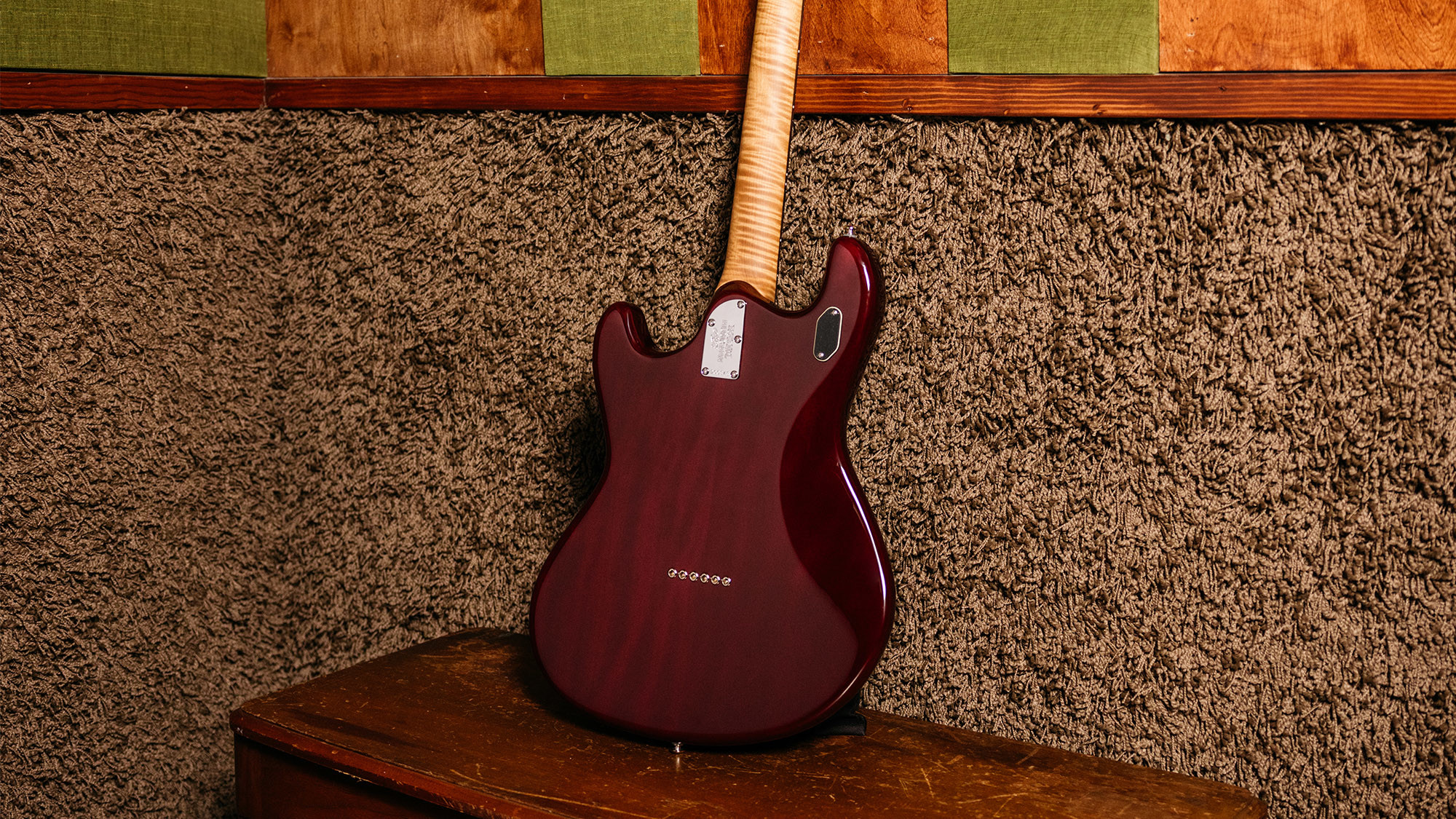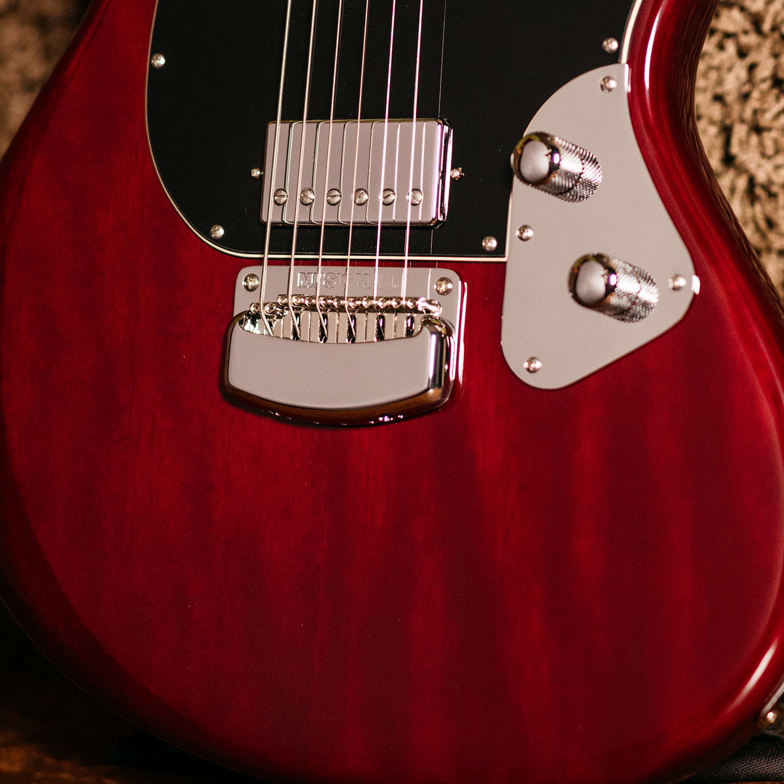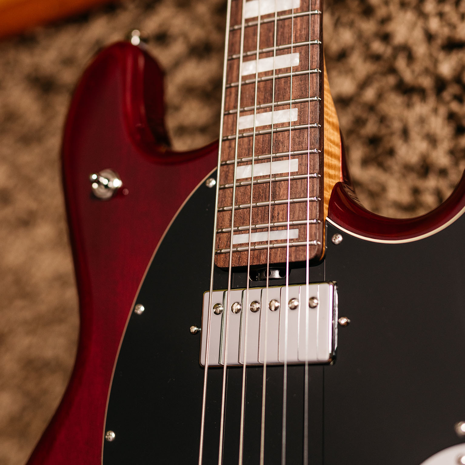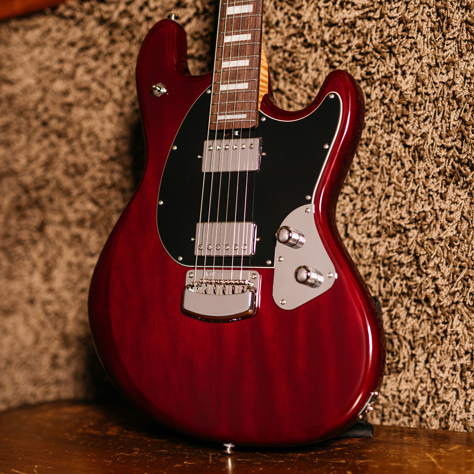 The all-new Ball Family Reserve Baritone StingRay guitar is limited to just 50 units worldwide. With a 27.5" scale length and tuned B-B, this guitar offers exceptional tonal depth and versatility. Its Okoume body in a striking translucent Oxblood finish showcases the wood’s natural beauty, while the roasted figured maple neck with an oil and wax finish ensures smooth playability and stability. The 24 stainless steel frets and rosewood fretboard adorned with white pearloid block inlays provide both durability and classic aesthetics. The hardtail string-through-body bridge ensures solid sustain, and the custom humbucking pickups deliver a powerful, clear tone that captures the rich, extended range of the baritone without getting muddy or woofy.