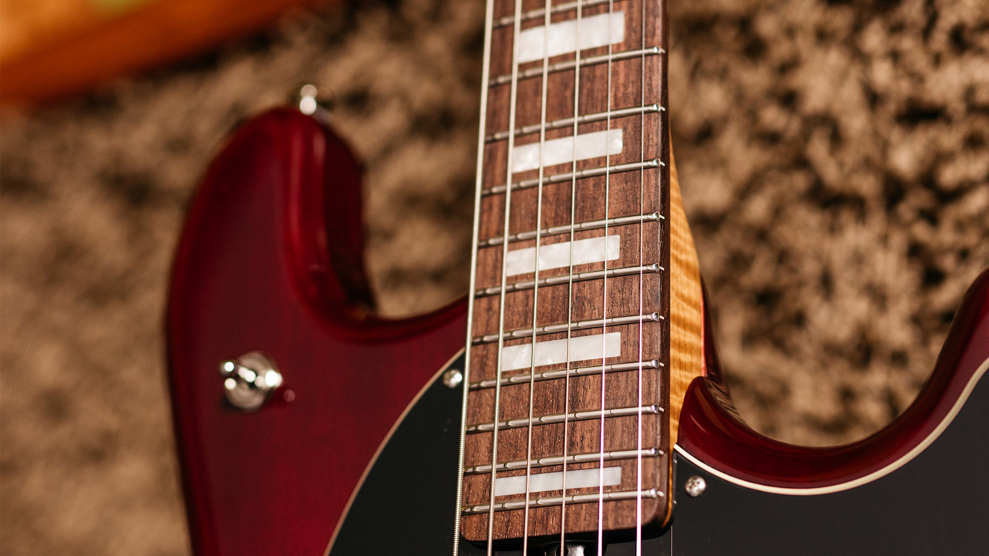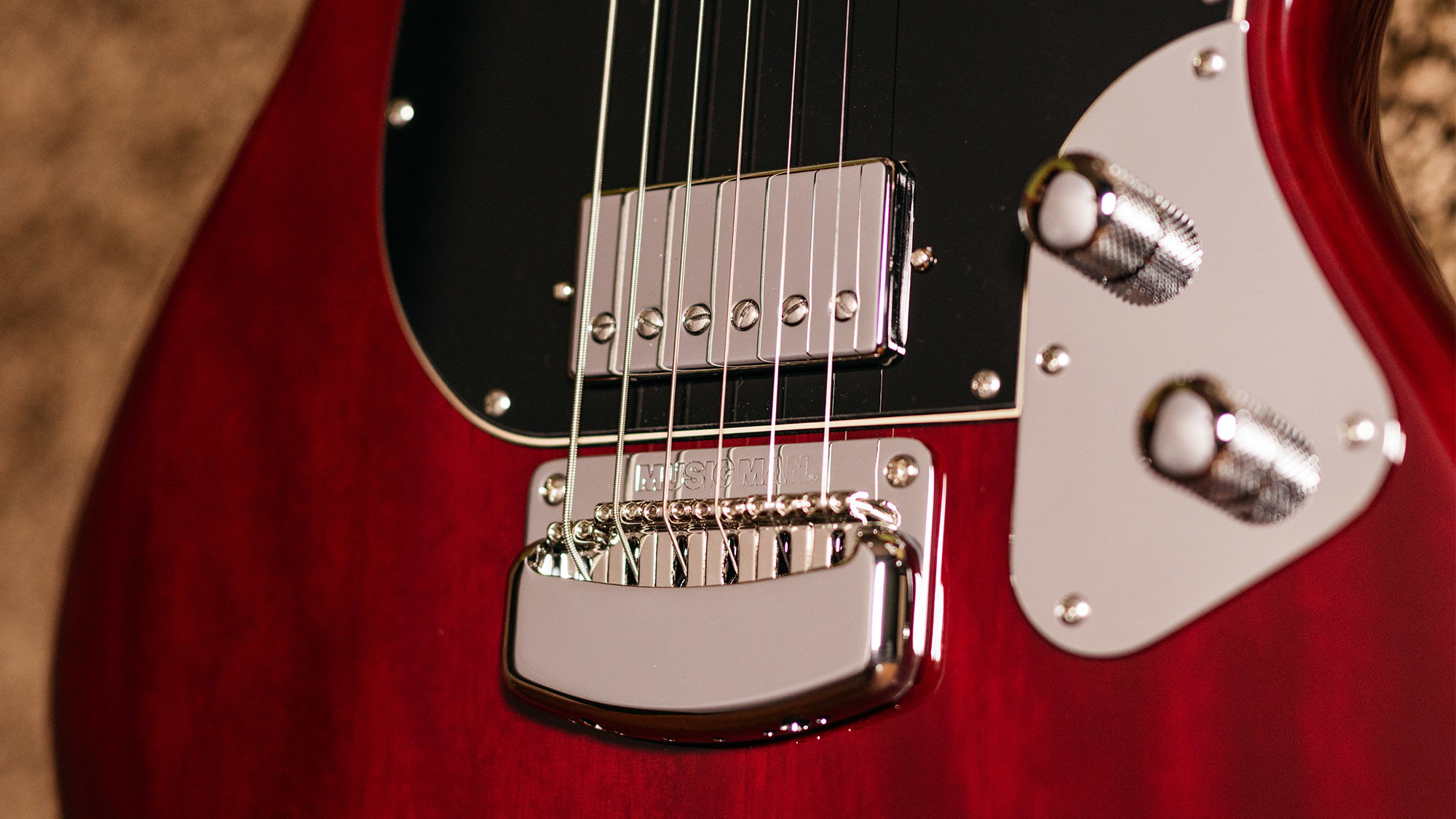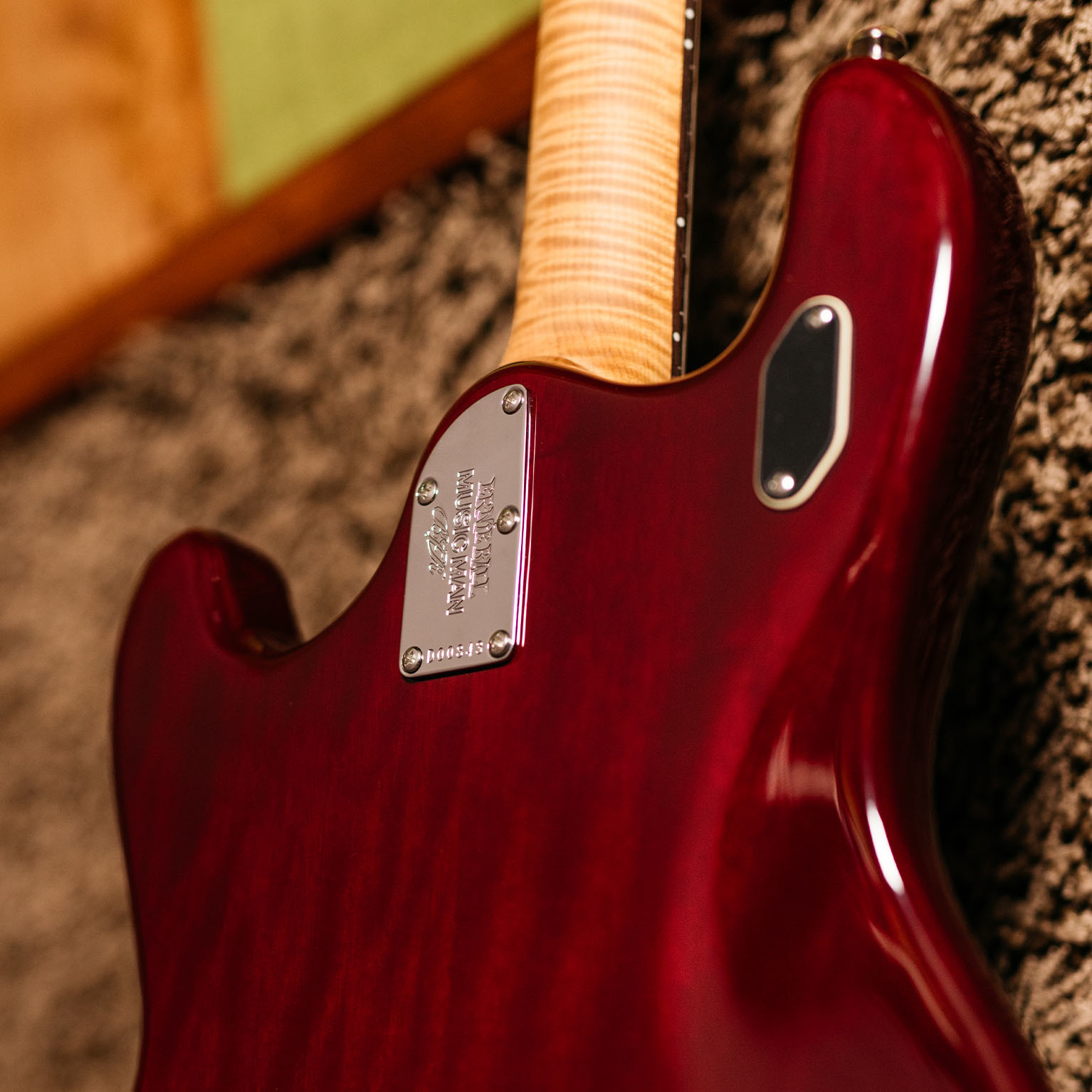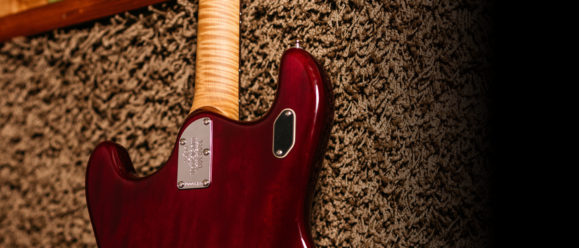 The all-new Ball Family Reserve Baritone StingRay guitar is limited to just 50 units worldwide. With a 27.5" scale length and tuned B-B, this guitar offers exceptional tonal depth and versatility. Its Okoume body in a striking translucent Oxblood finish showcases the wood’s natural beauty, while the roasted figured maple neck with an oil and wax finish ensures smooth playability and stability. The 24 stainless steel frets and rosewood fretboard adorned with white pearloid block inlays provide both durability and classic aesthetics. The hardtail string-through-body bridge ensures solid sustain, and the custom humbucking pickups deliver a powerful, clear tone that captures the rich, extended range of the baritone without getting muddy or woofy.